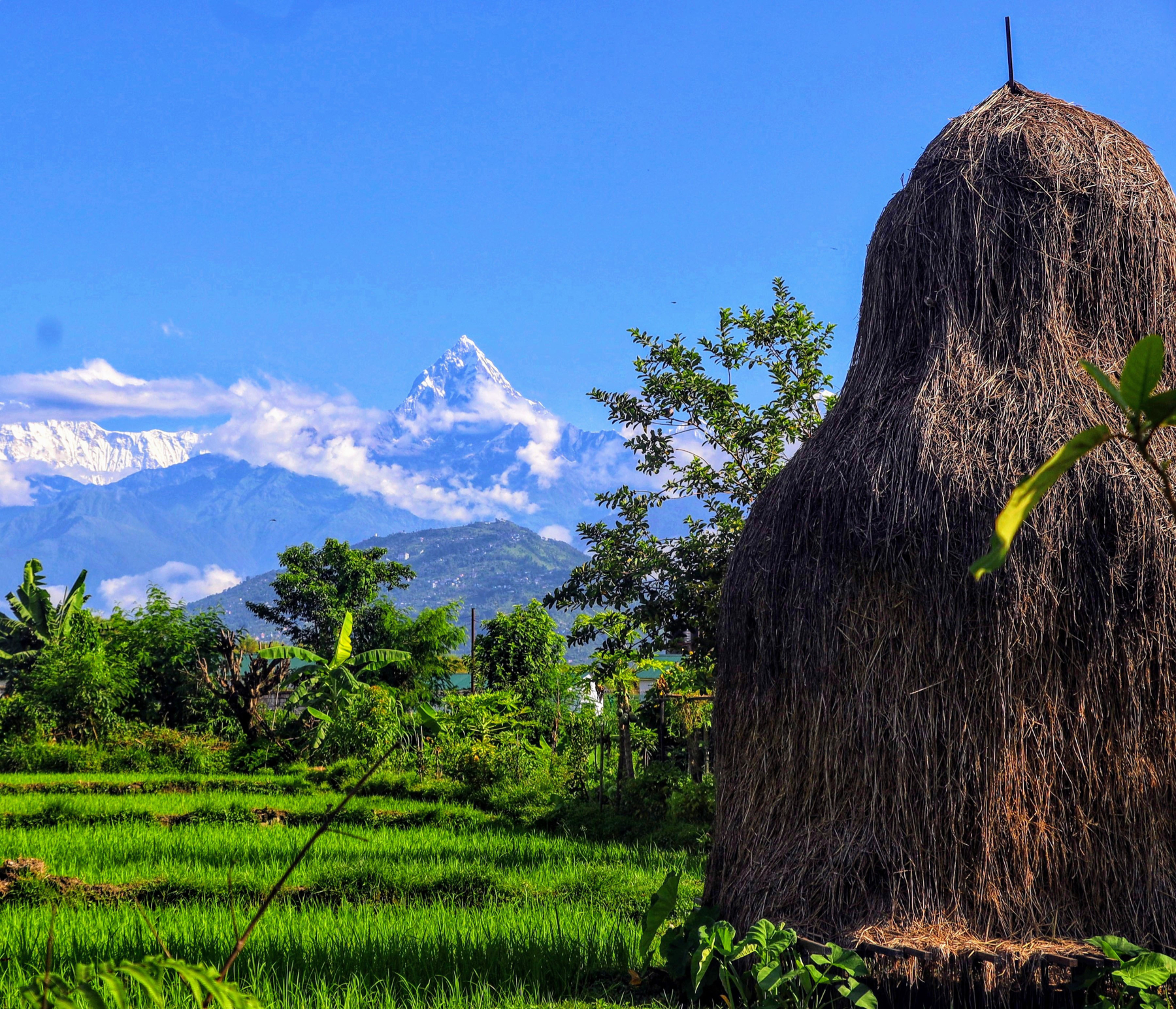 पोखराका महानगरपालिका-१४ भोटेचौतराबाट सोमबार बिहान मौसम खुलेसँगै देखिएको हरियाली धान खेत र माछापुच्छ्रे हिमाललगायतको दृश्य।