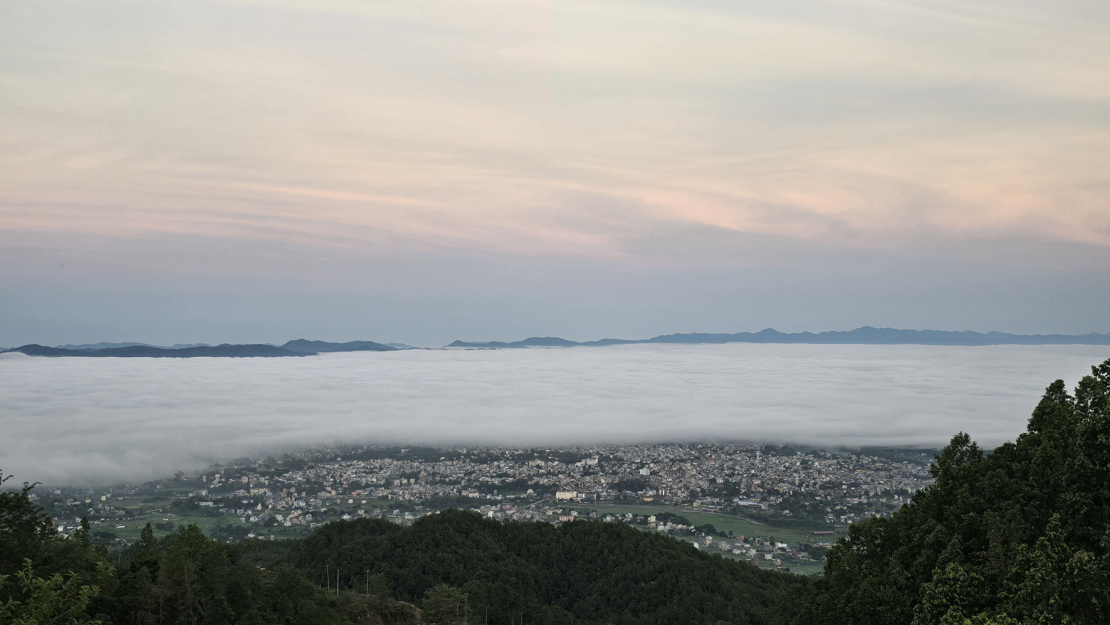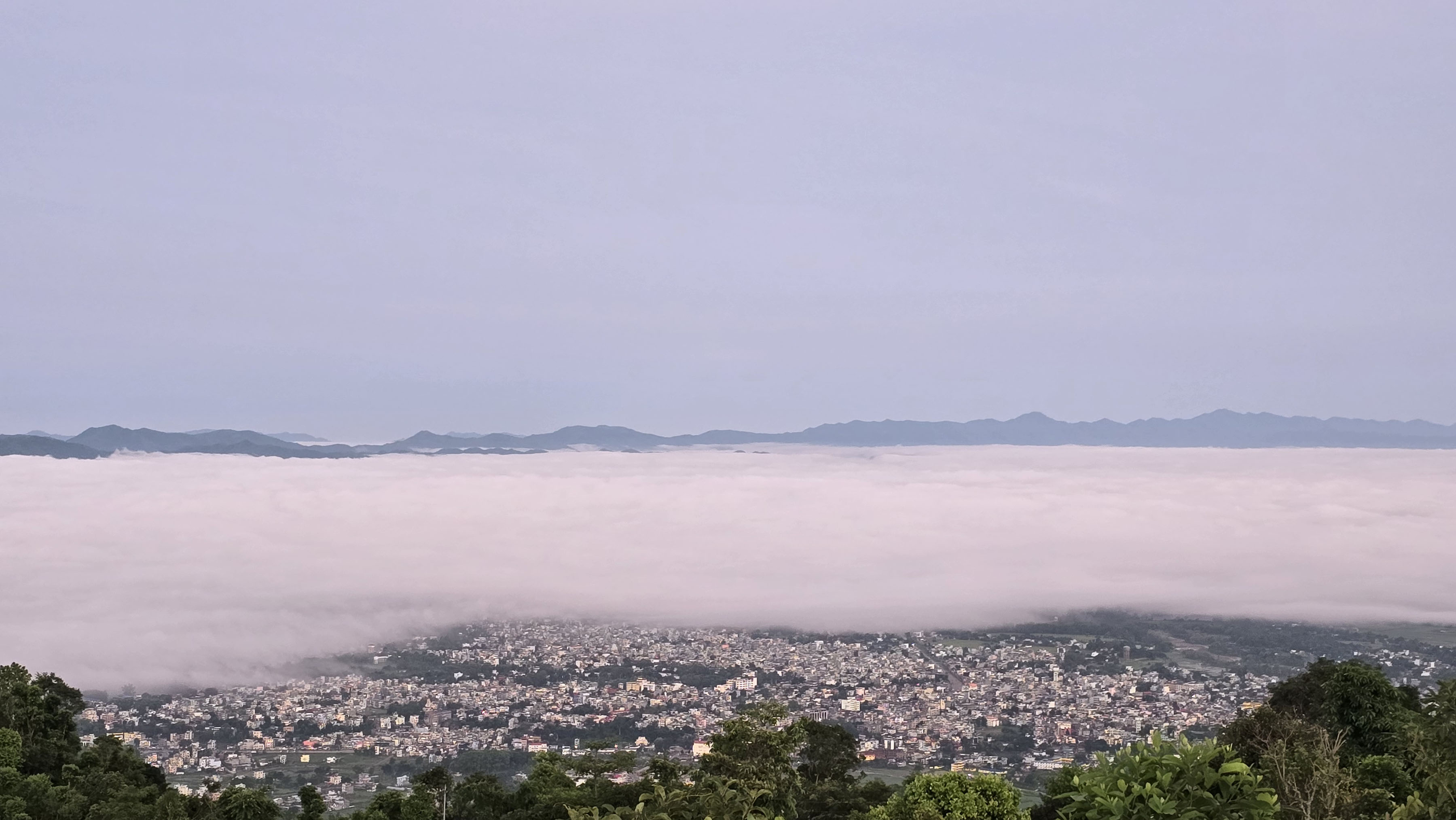दाङको घोराही उपमहानगरपालिका- १८ स्थित घोरदौराबाट बिहीबार बिहान देखिएको बादलले ढाकेको घोराही बजार र आसपासको दृश्य ।