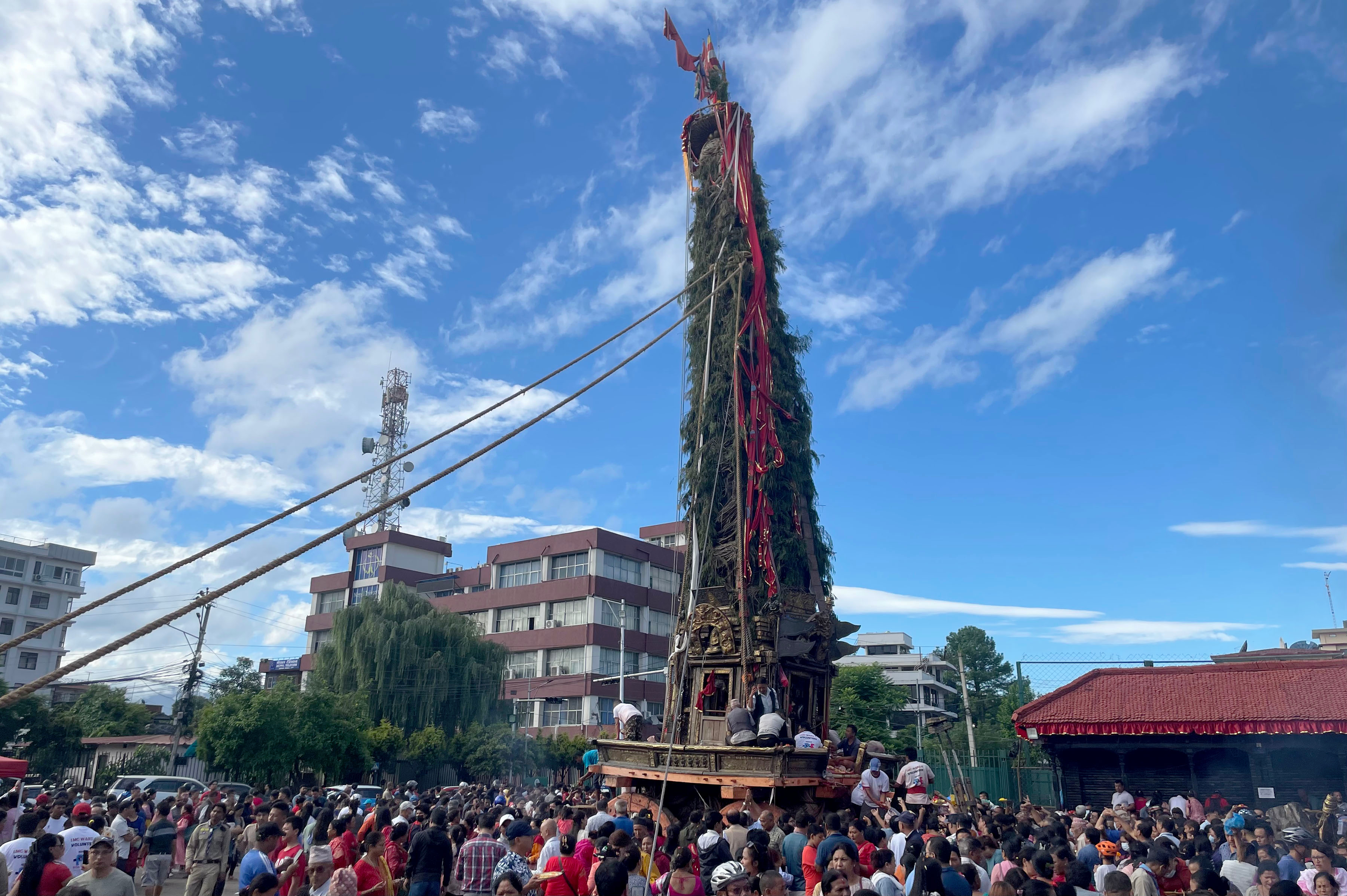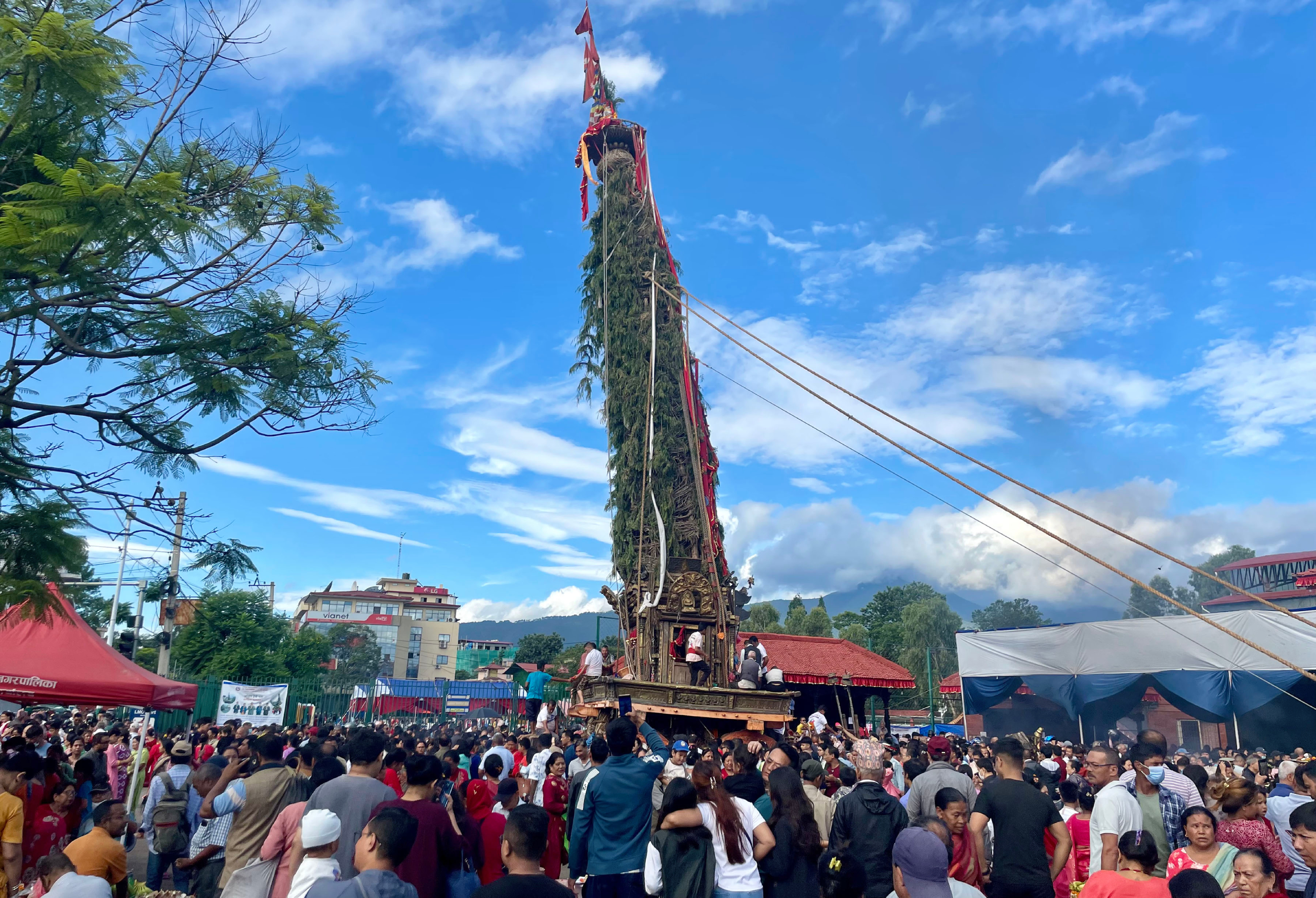 ललितपुरको जावलाखेलमा पुर्याइएको रातो मछिन्द्रनाथको रथमा पूजा गर्दै भक्तजन । जावलाखेलमा आज रातो मच्छिन्द्रनाथको भोटो देखाउने कार्यक्रम छ ।