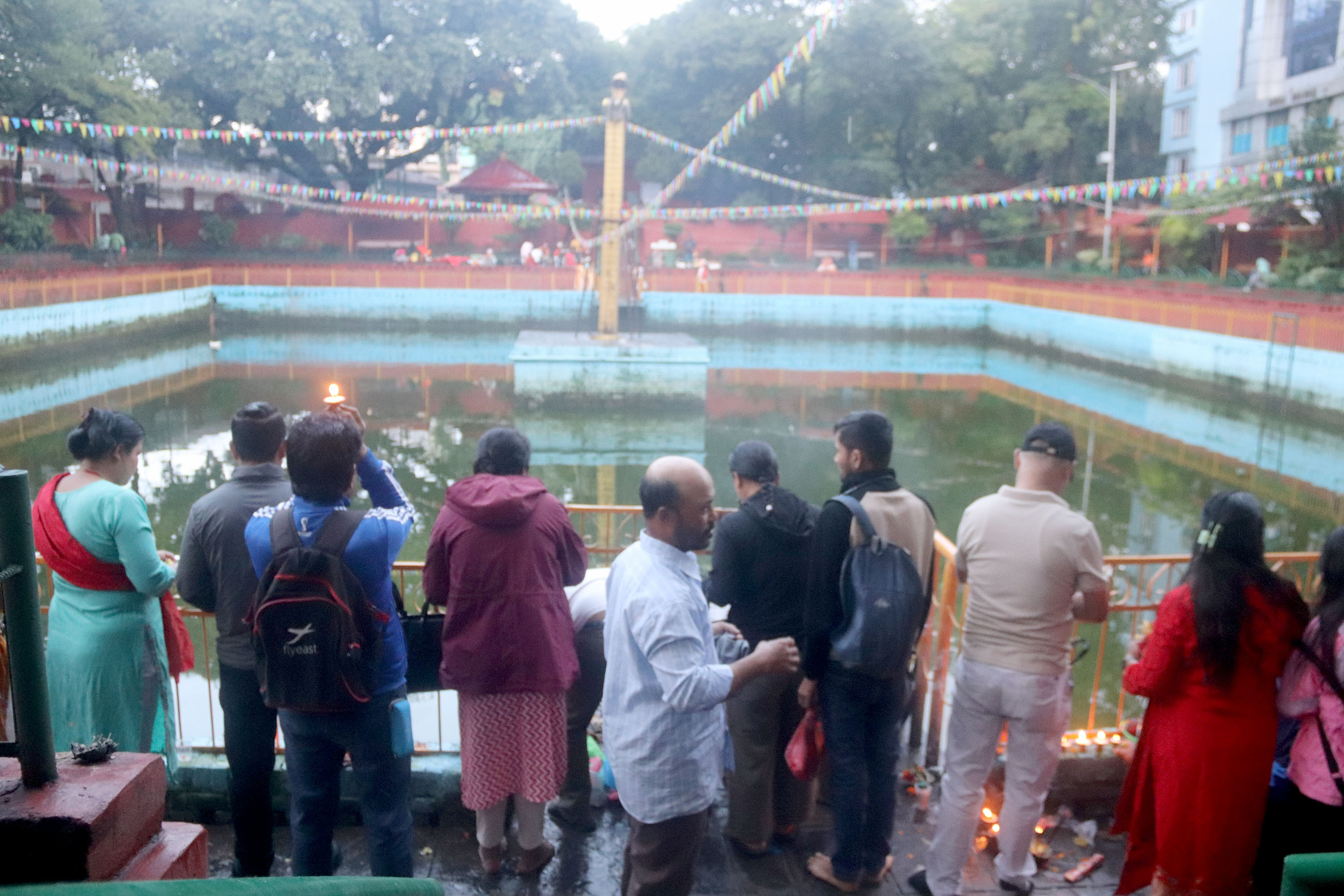 काठमाडौं महानगरपालिका–१ स्थित नागपोखरीमा नागको पूजा आराधना गर्दै भक्तजन। आजको दिन नागको तस्बिर घरको ढोकामा टाँस्दा वर्षभर घरमा नाग, सर्प र बिच्छी लगायतका जीवले दुःख नदिनुका साथै अग्नि, मेघ र चट्याङको भयबाट पनि बच्न सकिन्छ भन्ने धार्मिक विश्वास रहेको छ। तस्बिर: रासस