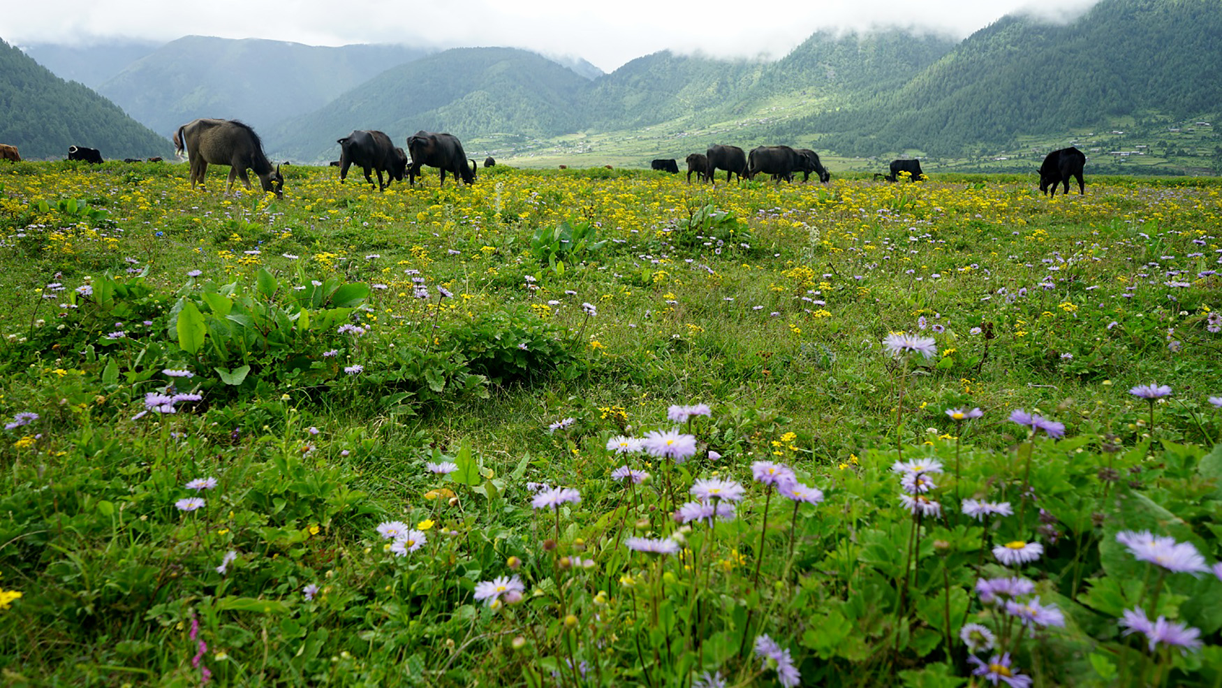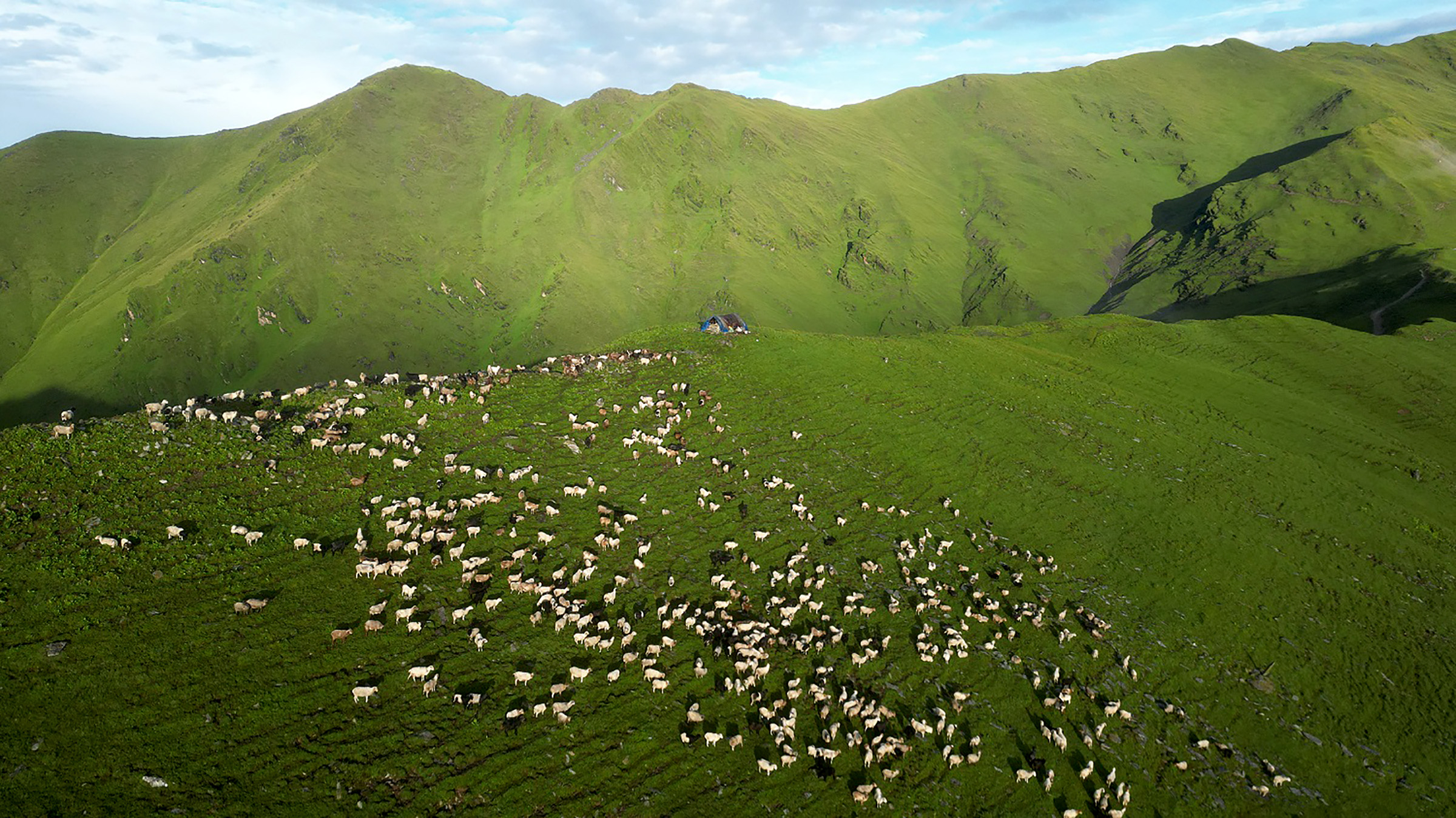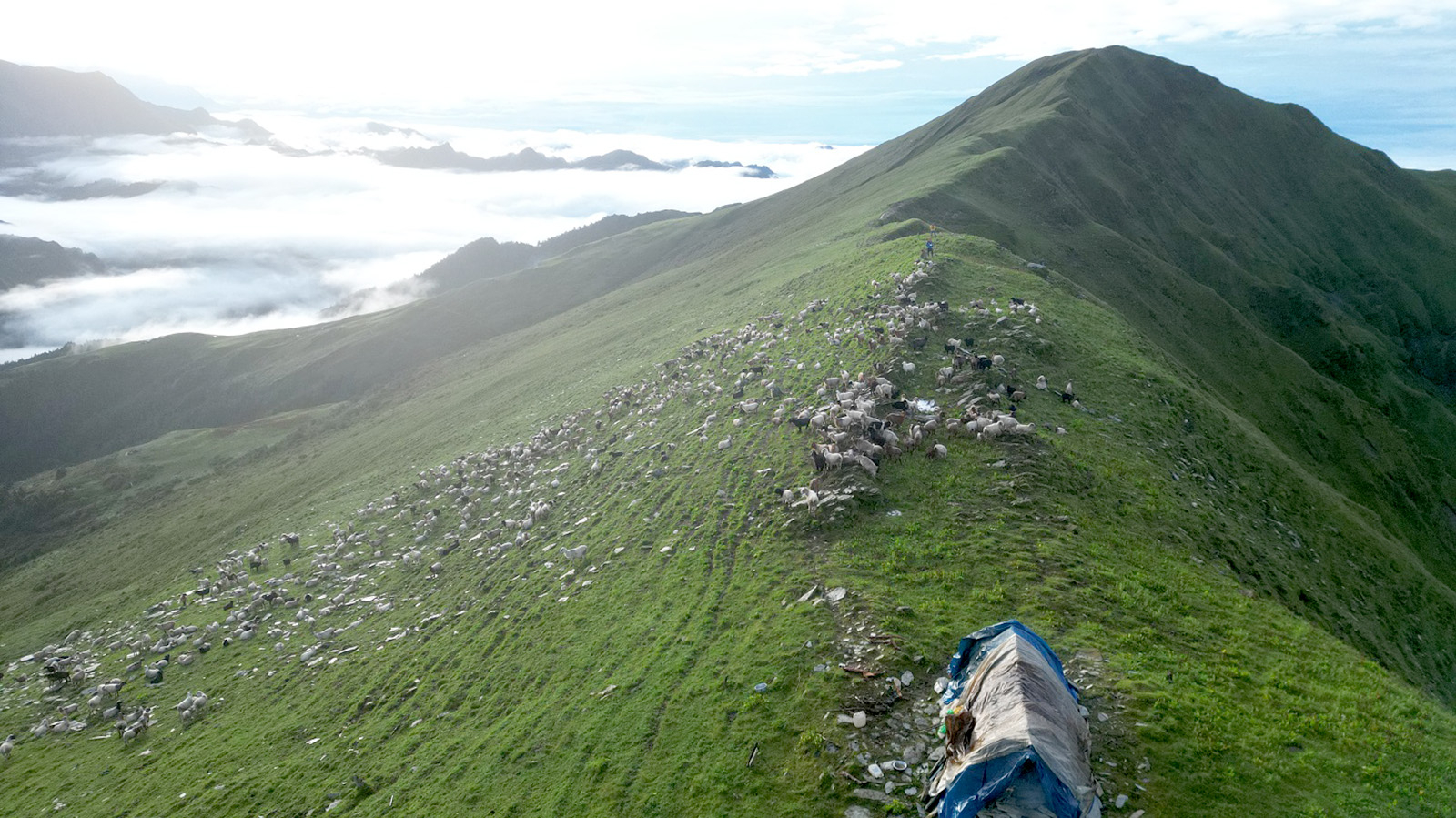 पूर्वी रुकुम, बागलुङ र म्याग्दी जिल्लामा फैलिएको ढोरपाटन सिकार आरक्षको समुन्द्र सतहदेखि चार हजार मिटर उचाइको गर्पाछेडाको डाँडामा रहेको भेडी गोठ। म्याग्दी, बागलुङ, पूर्वी रुकुमका किसानले पशुलाई पोसिलो घाँस खुवाउन ढोरपाटनको बुकी पाटनमा लगेका छन्। तस्बिर: रासस
