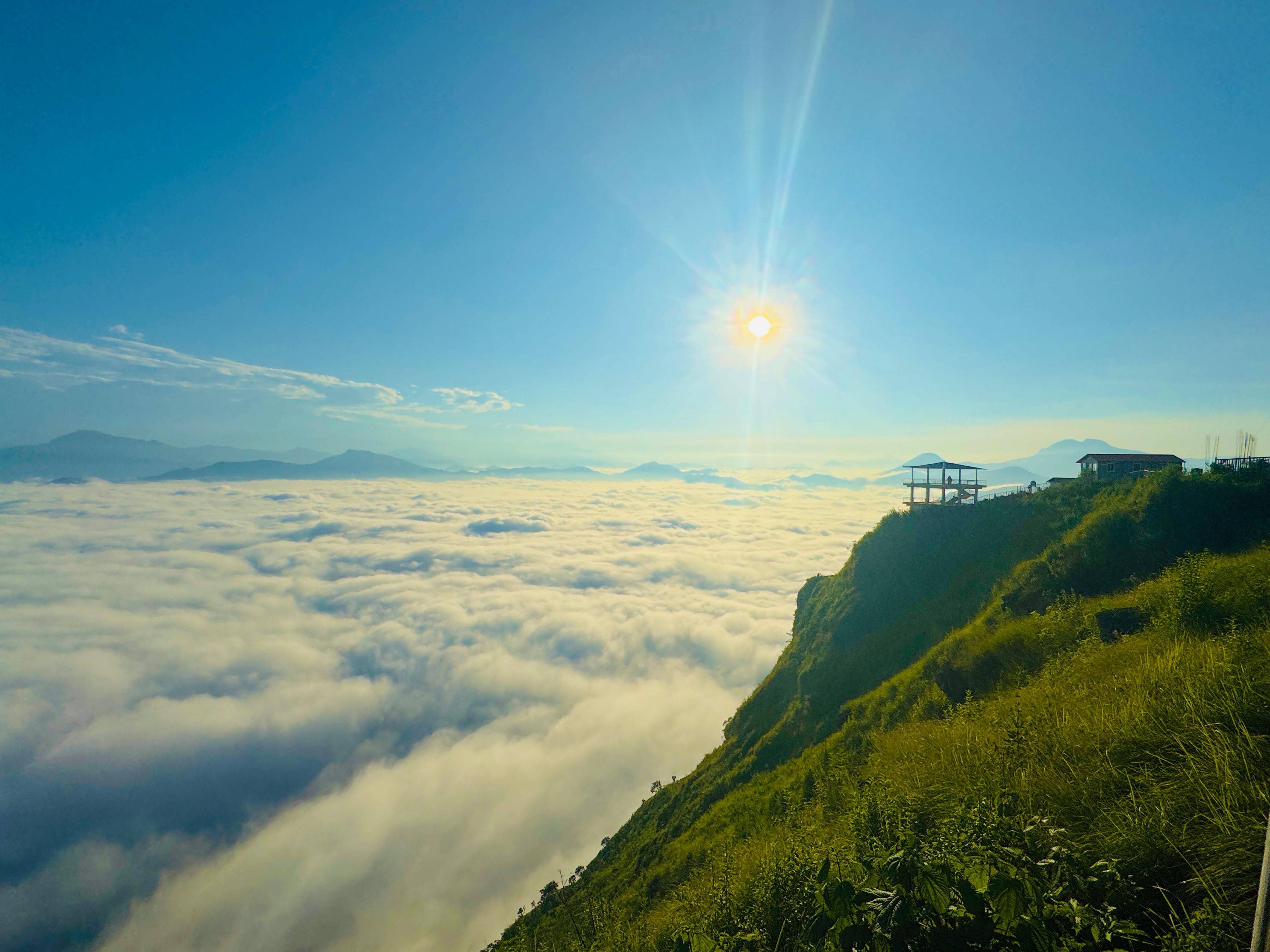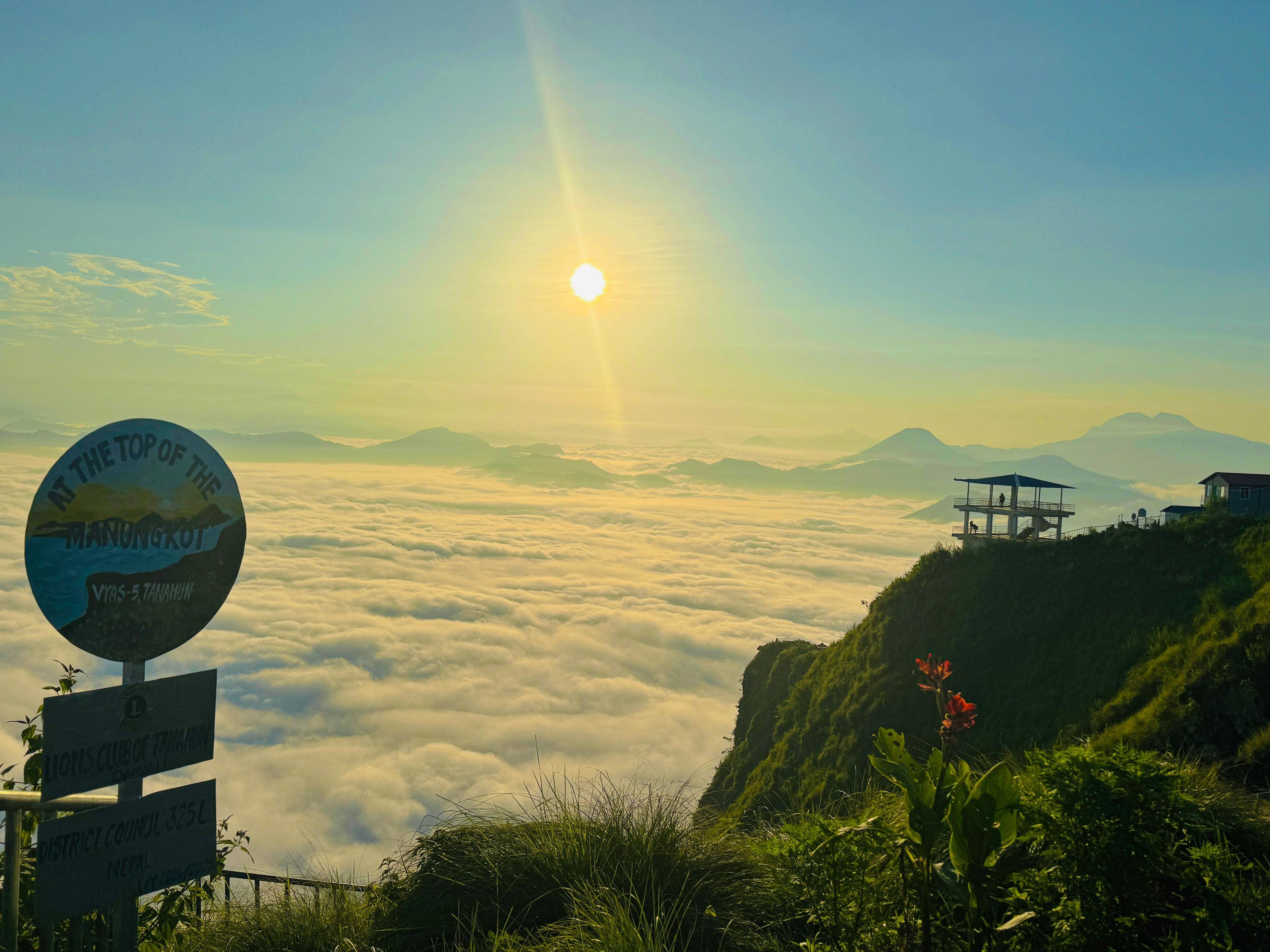 तनहुँको व्यास नगरपालिका-५मानुङकोटबाट शनिबार बिहान देखिएको मनोरम दृश्य। कुहिरोले दमौली बजार ढपक्क ढाकेको र सूर्योदयको दृश्य हेर्न आन्तरिक पर्यटक मानुङकोट पुग्ने गरेका छन्।