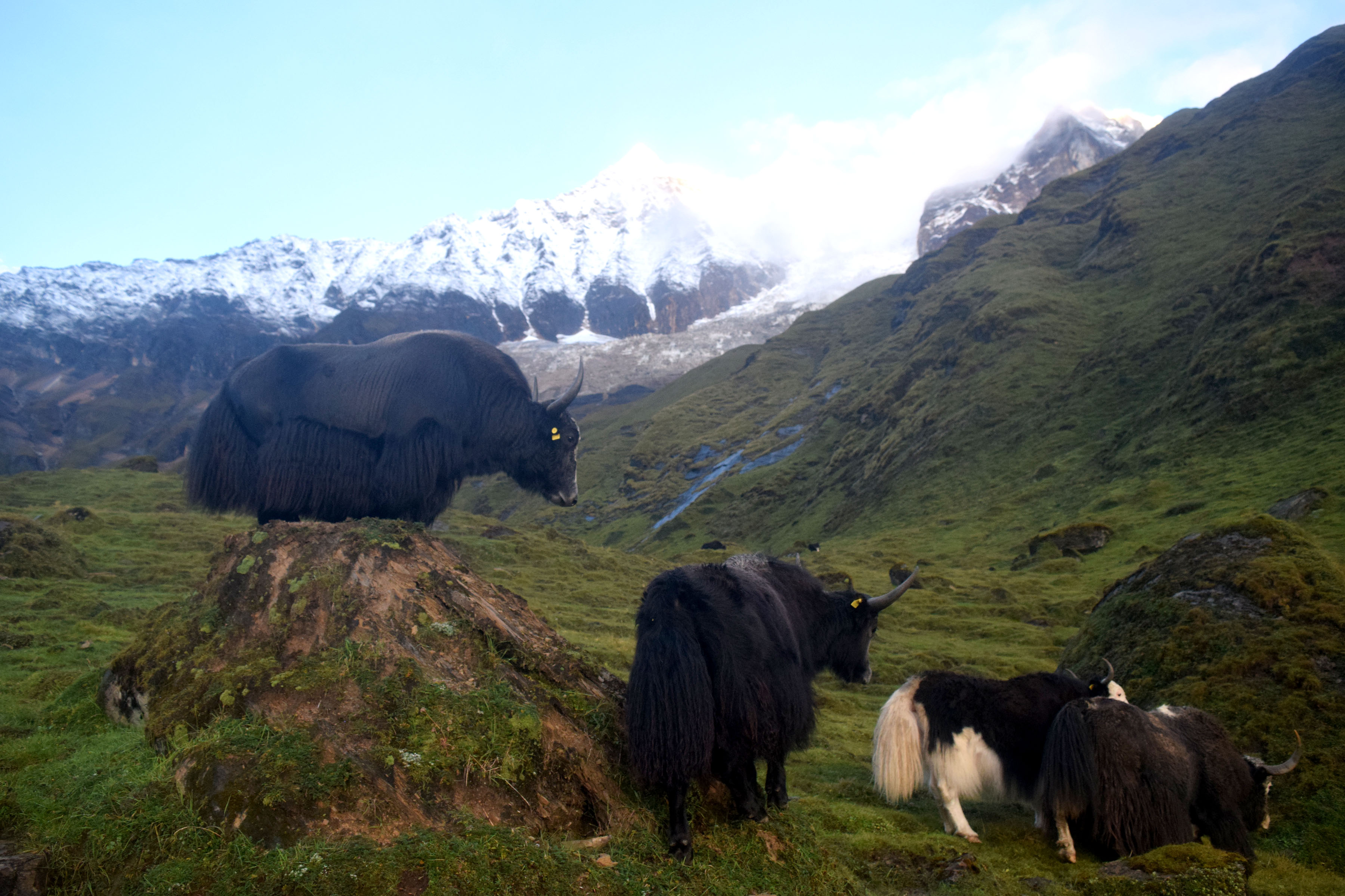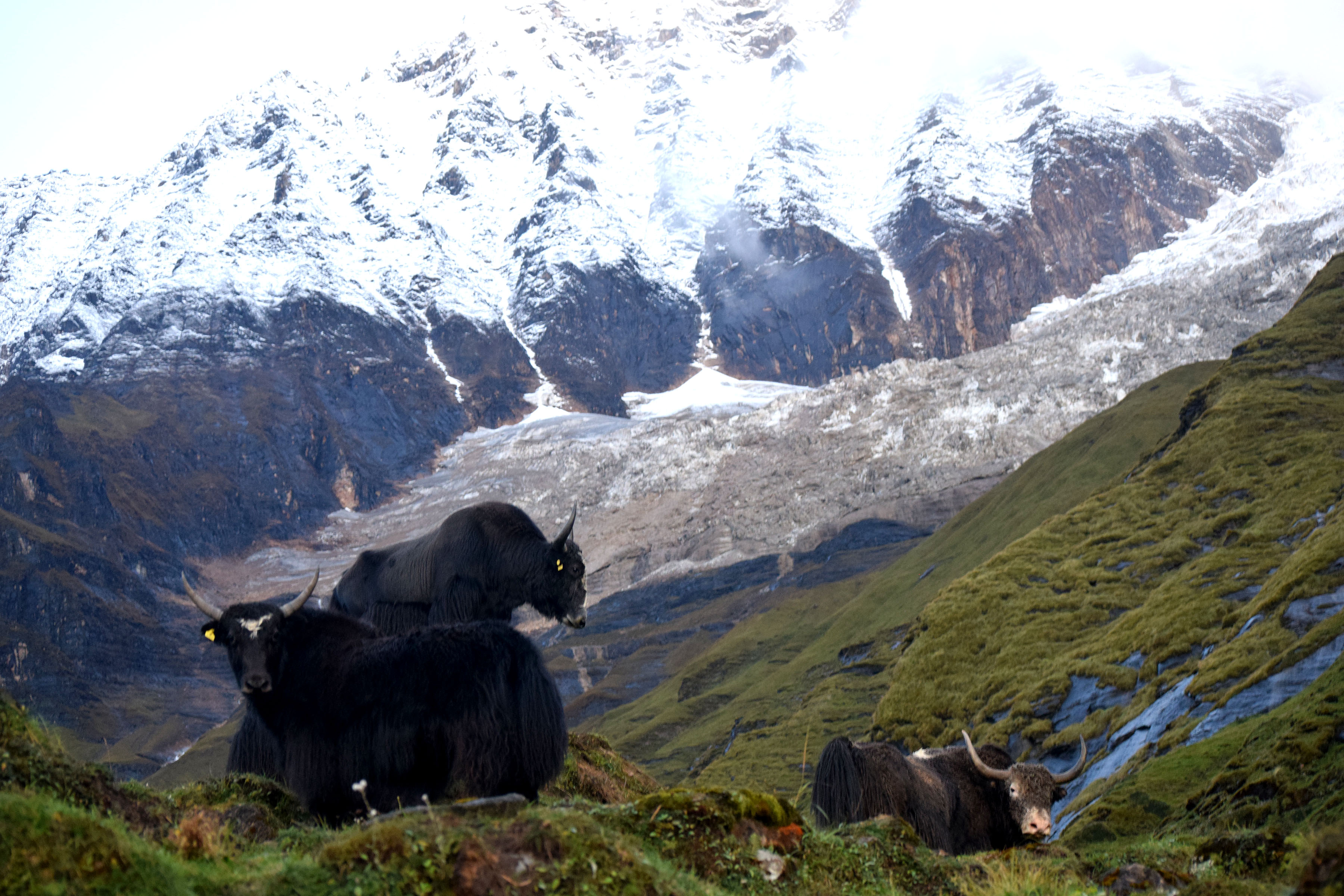 मुस्ताङको थासाङ गाउँपालिका–२ को बुकी पाटनमा धौलागिरी हिमशृङ्खलाको फेदीमा चरनक्षेत्रमा रहेका चौँरीहरू। यहाँ परम्परागत रुपमा गोठ राखेर चौँरीपालन हुँदै आएको छ। तस्बिर: रासस